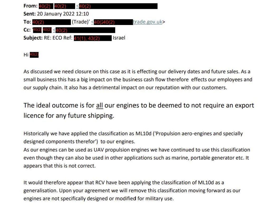 By January 2022, an RCV Engines director was telling the trade department that the company’s engines should fall outside the export licence regime entirely.