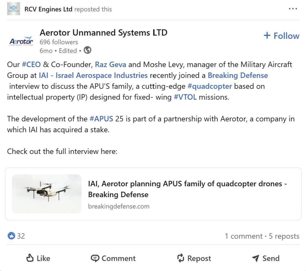 However, RCV Engines shared a post from Aerotor on LinkedIn in 2024 about the military applications of the Apus 25 drone, powered by its own engines.