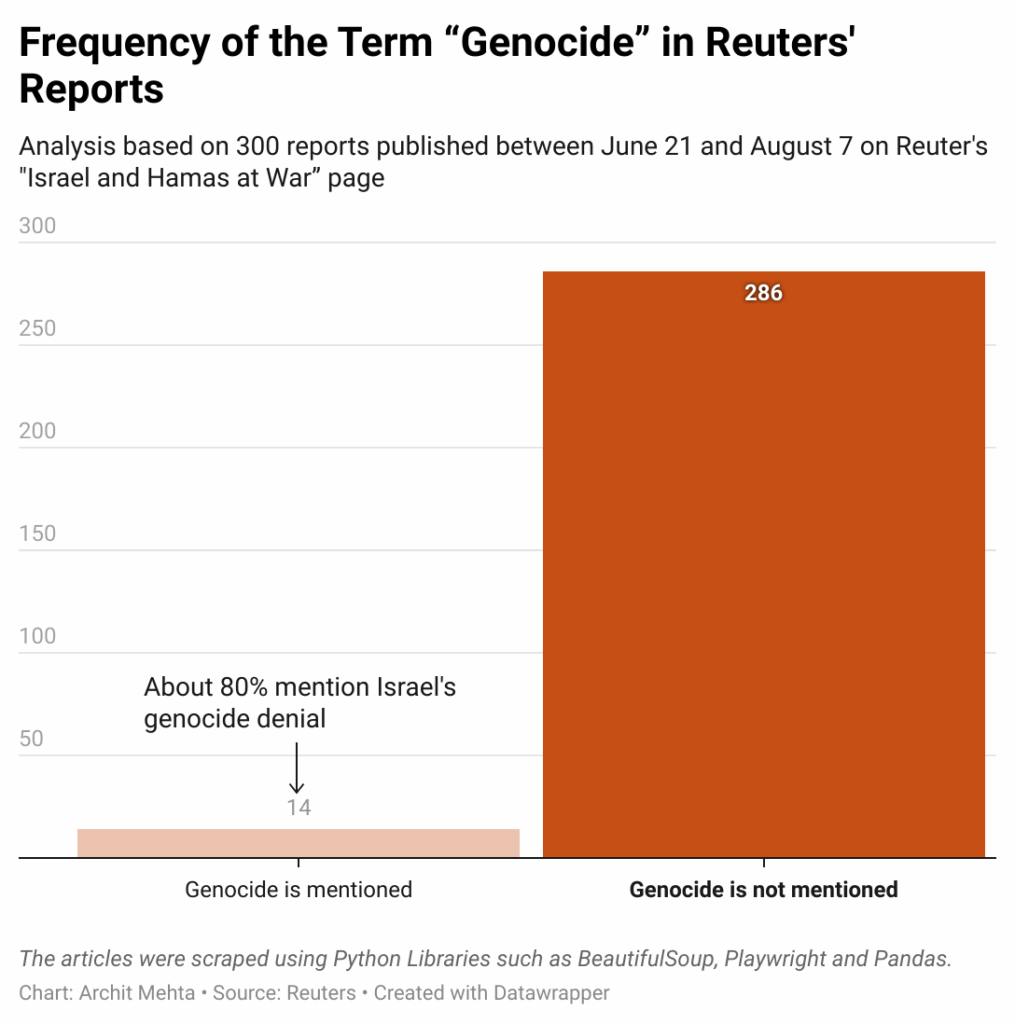 She added: “Reuters frames Israel’s atrocities in Gaza as part of an ongoing ‘war’ or ‘military campaign,’ rather than calling it a genocide, despite the consensus among human rights experts and international institutions that have concluded Israel is committing genocide.”