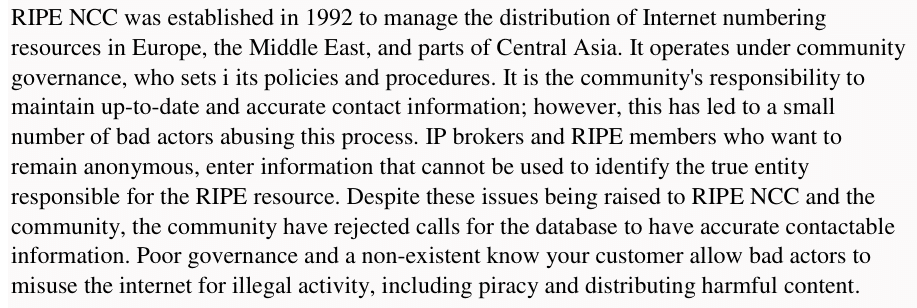 In the case of off-shore/bulletproof providers, beIN says that identifying the owner of an ASN using information held by RIPE NCC can prove impossible.