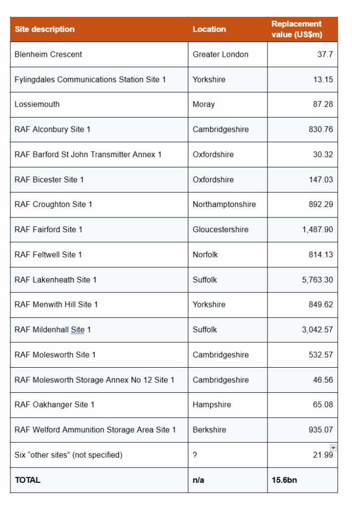 The US military owns 22 sites in Britain whose “replacement value” is $15.6bn (£11.4bn), according to a US War Department document found by Declassified UK.